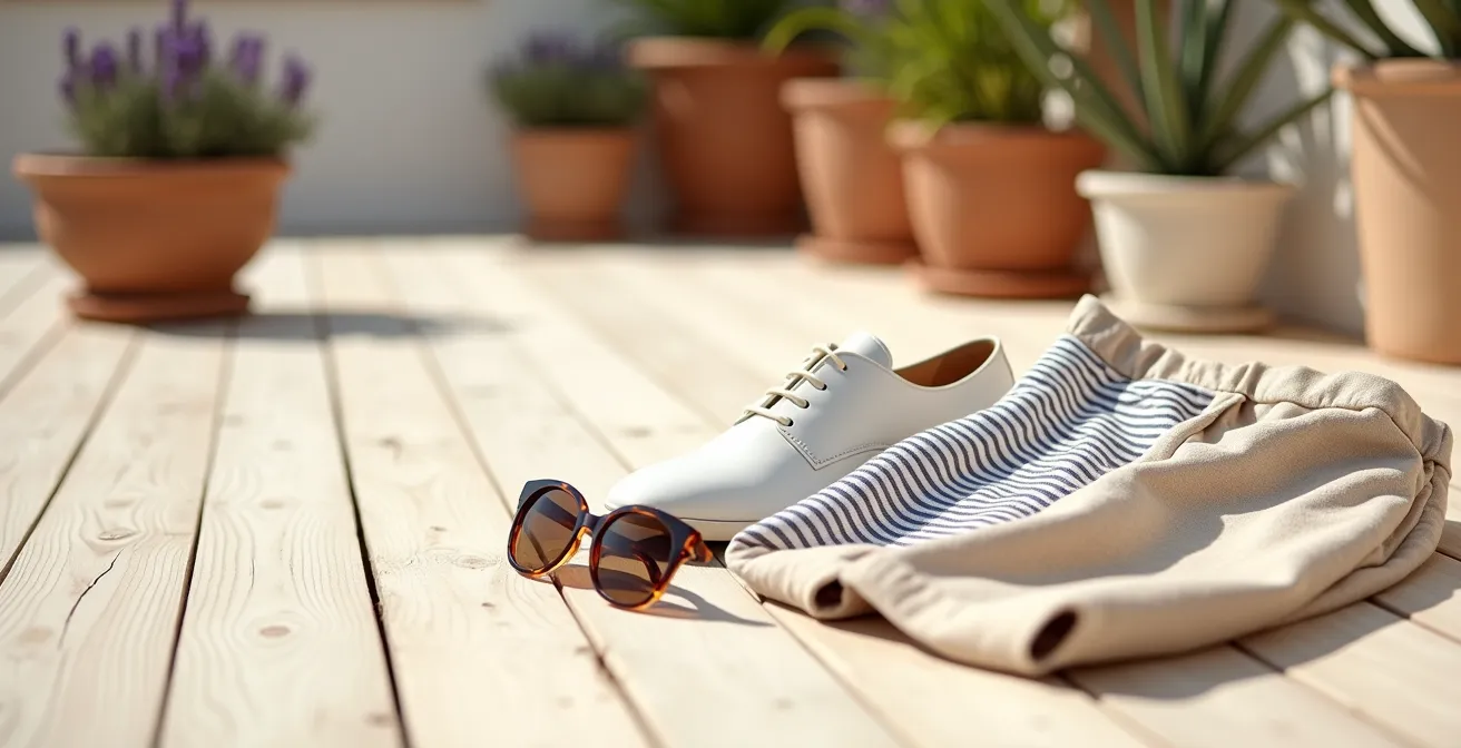 Pour bien visualiser l’élégance décontractée d’un look estival réussi, l’image ci-dessous capture l’essence d’une association maîtrisée dans un cadre méditerranéen.